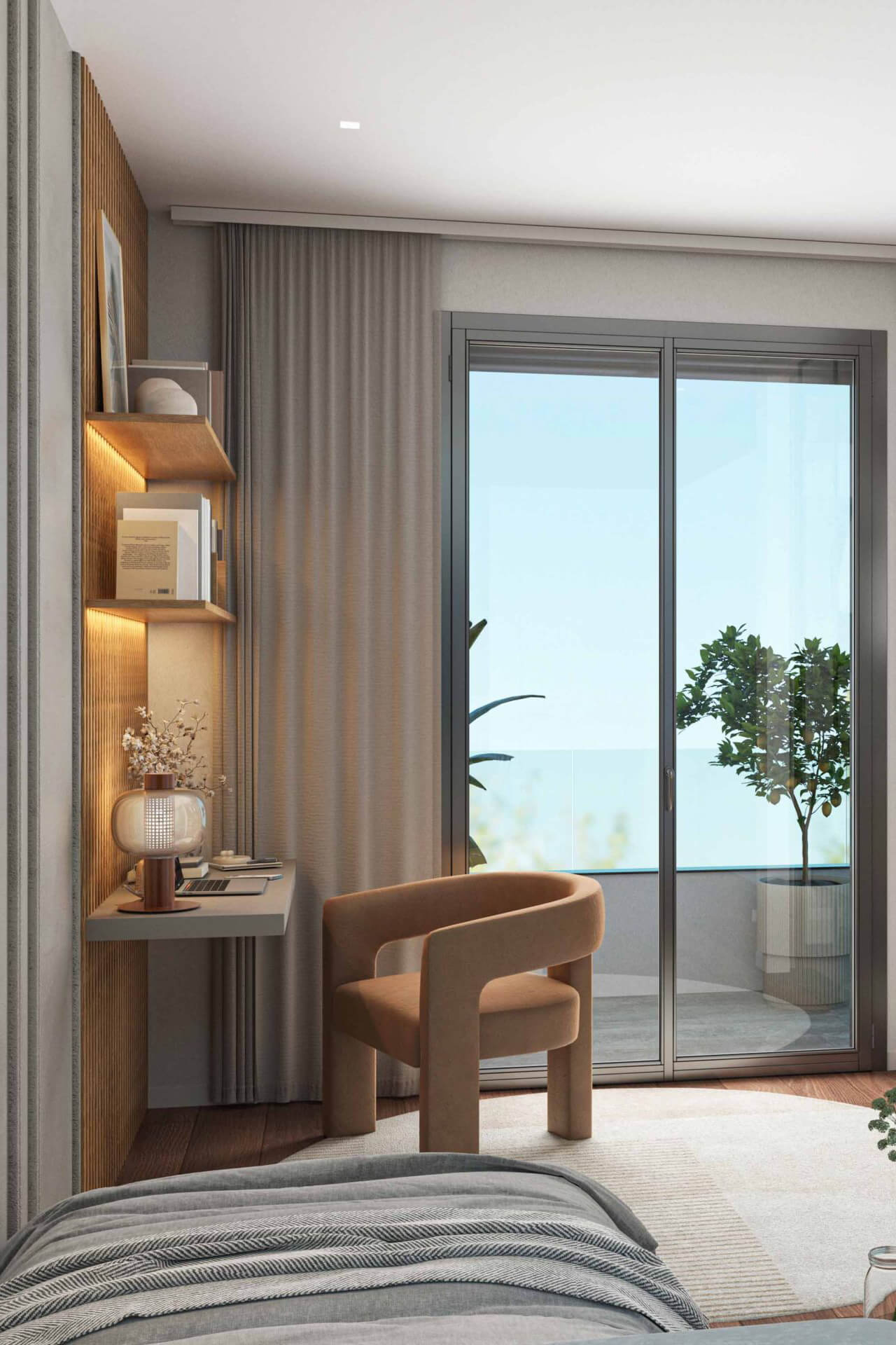 Die Villen bieten hochwertig ausgestattete Innenräume, die auf täglichen Wohnkomfort ausgelegt sind. Im Erdgeschoss befindet sich ein großzügiger, offener Wohnbereich mit Wohnzimmer, Küche und Esszimmer – aufgewertet durch große Fensterflächen und moderne Ausstattungen.